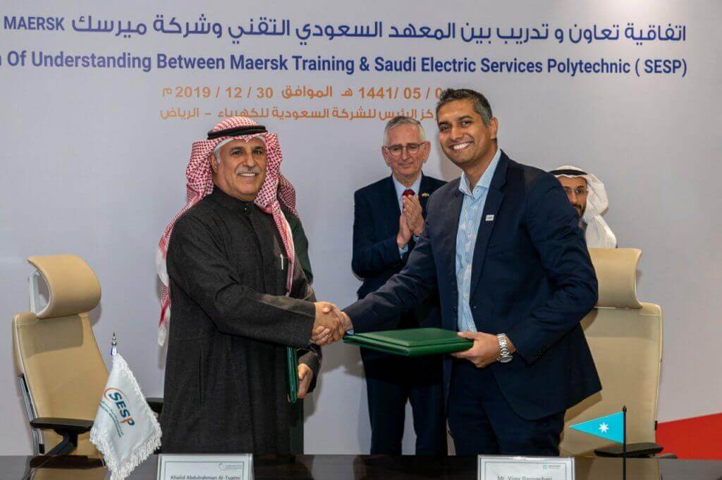Saudi Electric Services Polytechnic – SESP signs a cooperation and training agreement with the MAERSK Training – Denmark in the fields of energy in the auspicious presence of the CEO of the “Saudi Electricity Company” Mr. Fahd Al-Sudairy and Ambassador of Denmark “Mr. Ole Moesby”.